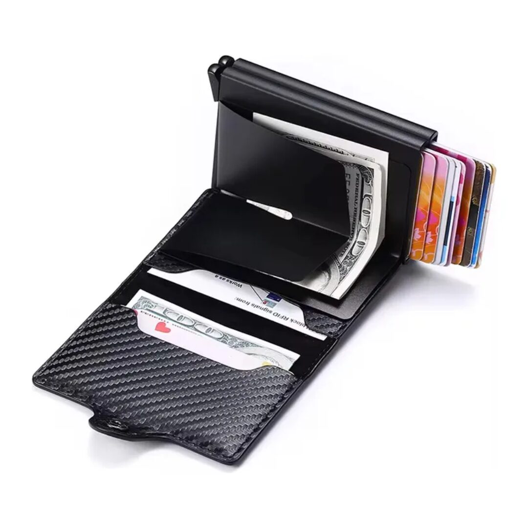 Cuenta con una capacidad de hasta 16 tarjetas y espacio para algunos billetes, brindando comodidad sin ocupar demasiado espacio.