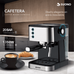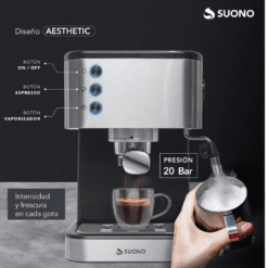 La Cafetera Express Suono es una combinación de diseño y funcionalidad, ideal para los entusiastas del café. Con un acabado en acero inoxidable y líneas elegantes, esta máquina se destaca tanto por su estética como por su rendimiento.