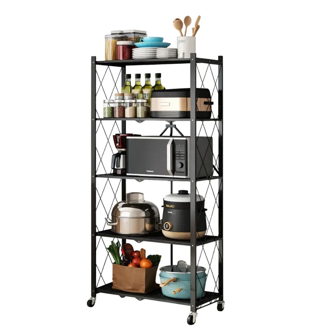 Estantería de almacenamiento de 5 niveles, resistente y plegable, equipada con ruedas para un fácil desplazamiento. Ideal para usar en biblioteca, dormitorio, cocina y más.