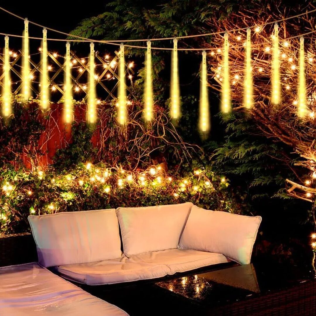 8 Cortinas de Luz Brillantes: Gran cobertura decorativa con 360 LEDs de blanco cálido que emiten una luz acogedora y elegante, perfecta para la Navidad.