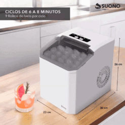 La Máquina Fabricadora de Hielo Suono es una solución eficiente y compacta para producir hielo en el hogar o en pequeñas oficinas. Con un diseño moderno en color blanco, se integra fácilmente en cualquier ambiente.