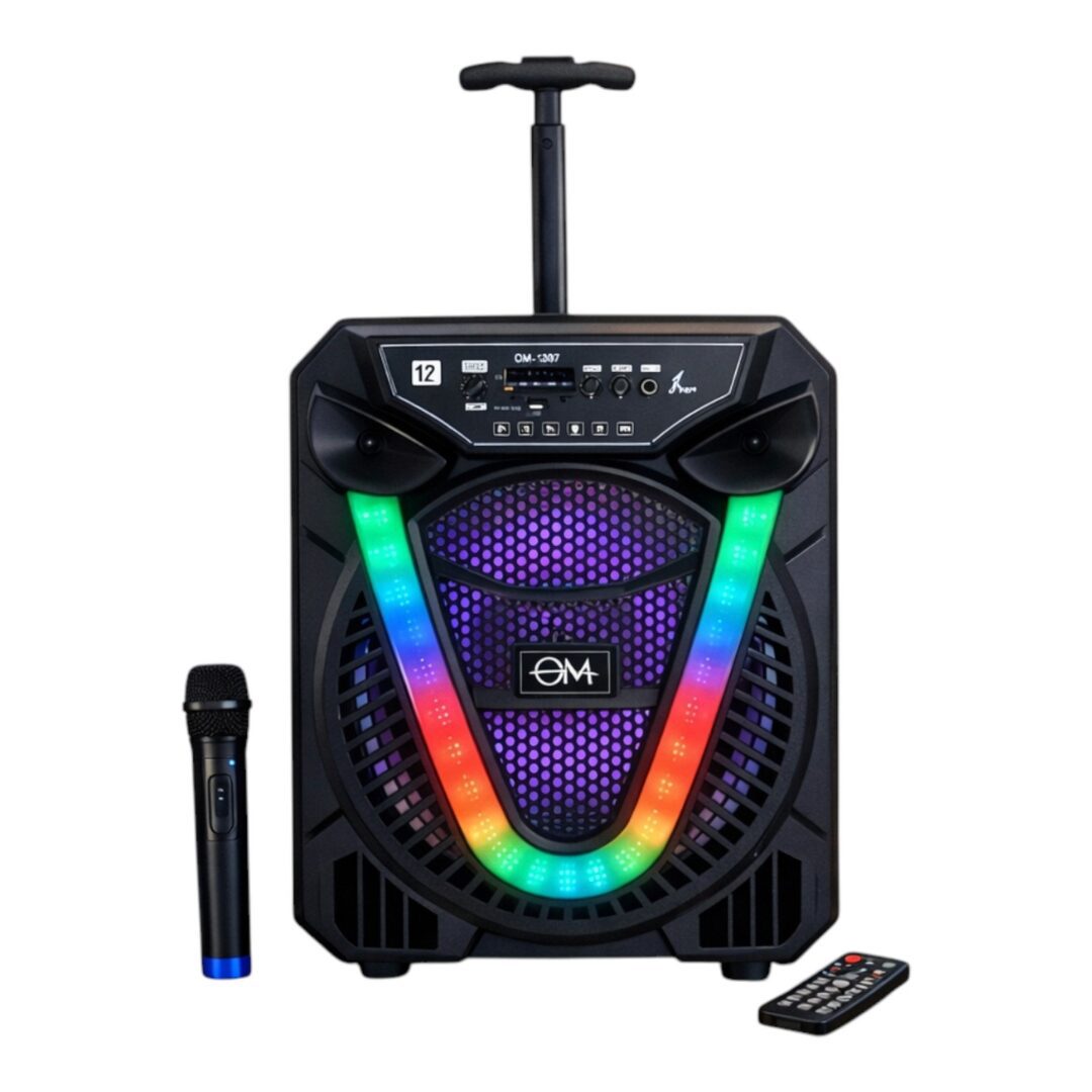 PARLANTE 12 PULGADAS OM-1207. Carrito con manija, con luces led RGB, micrófono y control remoto. Ideal para eventos y fiestas.