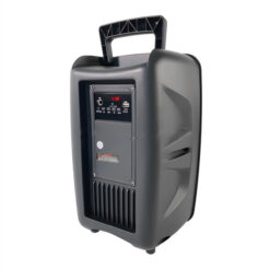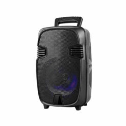 Ideal para transportar ya que viene con una manija y con rueditas. Incluye entrada USB, entrada para micrófono, lector de memoria Micro SD, Luces LED, entrada auxiliar 3,5 mm.,conexión por Bluetooth, función Karaoke y una gran potencia de sonido.