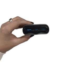 Cuenta con un botón lateral para encender el power bank y del otro lado cuenta con un indicador lateral de 4 luces que indican en 100%, 75%, 50% y 25 % de la batería.